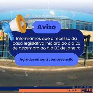 A Câmara de Vereadores entrara em recesso dos dias 20/12 ao dia 02/01, em caso de dúvidas entre em contato ! Fiquem atentos as nossas